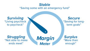 Lastly, we focus on HOPE. Jeremiah 29:11 says, “’For I know the plans I have for you,’ declares the Lord, ‘plans to prosper you and not to harm you, plans to give you a hope and a future.’” Our future depends on the margin that we built up (one of our habits). We need this buffer to respond to the calling that the Lord has placed on our lives. Typically, we fall somewhere on the following spectrum of what Blue Trust calls the “Margin Meter”: