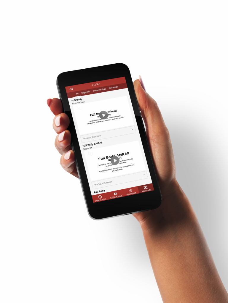 When you get to the LU Fit page, you will be able to see all of the LaHaye Rec & Fit and David’s Place workout spaces that are offered. On the bottom of your screen, you’ll see access to a map of LaHaye, a Stopwatch feature to use during workouts, and then a Workouts tab.