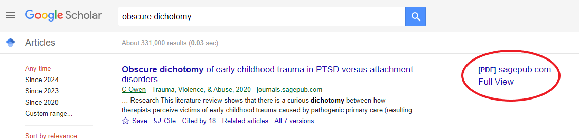 - Do not include hyperlinks that require log-on credentials to access, unless required by your assignment. This includes OpenAthens links obtained from searches in the Liberty University library databases. APA requires a DOI number whenever available, or a direct URL if a DOI is not available. If neither are available, do not add any other kind of link. Check Google Scholar for hidden DOIs and direct URLs (which will appear in the right column of your search results (see example below; click on it to get the full direct URL):