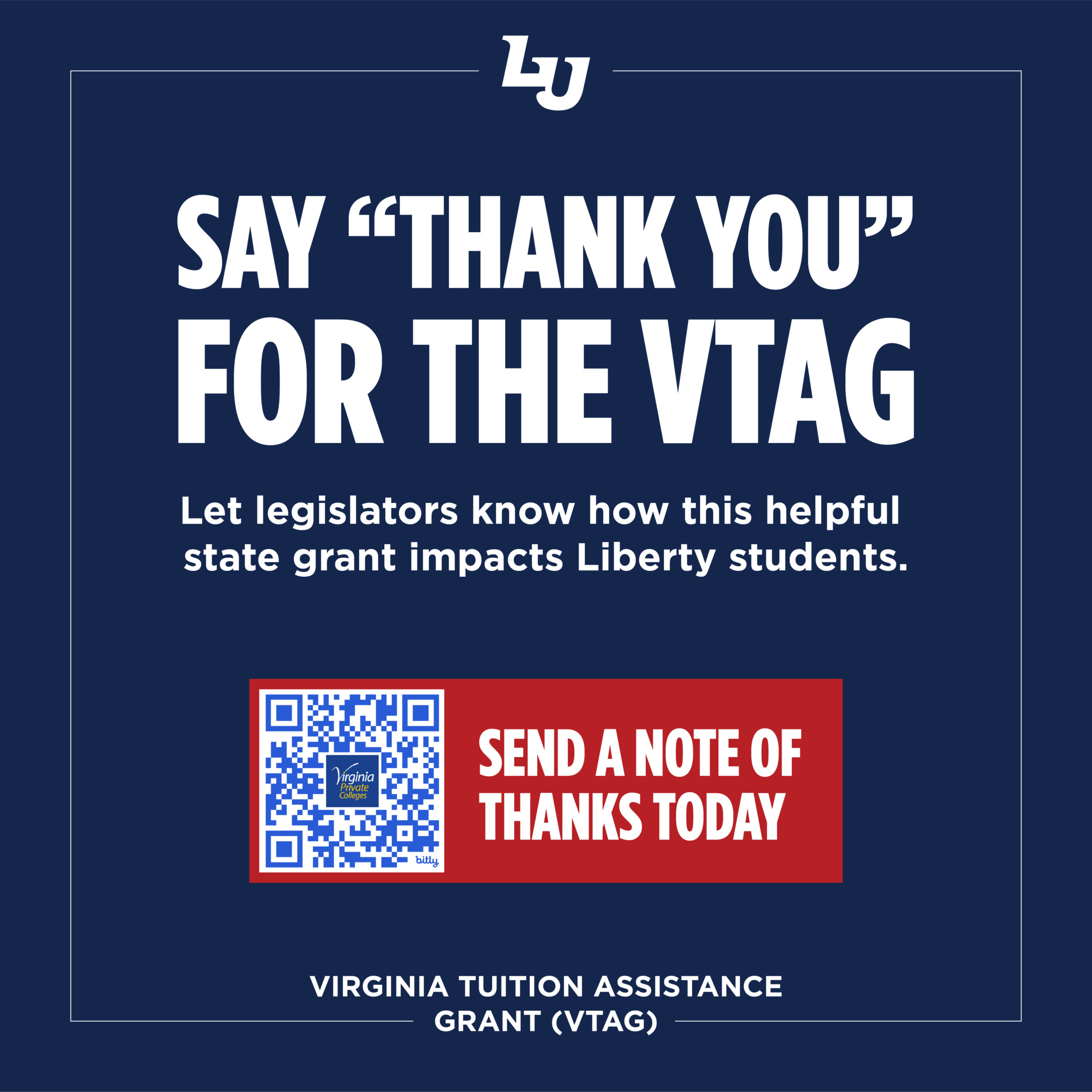 If your son or daughter has benefited from the Virginia Tuition Assistance Grant (VTAG), we need your help! During the months of January and February, we are reaching out to students and their families, asking for them to take a few minutes of time and express appreciation for the Virginia Tuition Assistance Grant (VTAG). The VTAG is a state-funded grant that has helped many students pay to attend Liberty University.