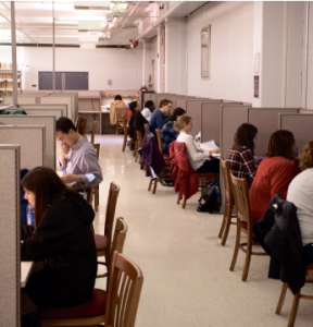 New books, New opportunties — The ILRC is currently adding new books to update their collection and to meet student and faculty needs. Student workers, such as Jessica Phillips (left) help maintain the collection by shelving books, making sure books are neat and in order and helping students find resources for projects. The ILRC also features numerous study areas (above).