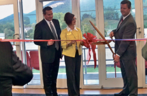 OPEN for business — Athletic Director Jeff Barber (left), Executive Vice President of Lynchburg Chamber of Commerce Christine Kennedy and Chancellor Jerry Falwell Jr. cut the ribbon during the public opening of the new Williams Stadium Press Tower on Oct.12.