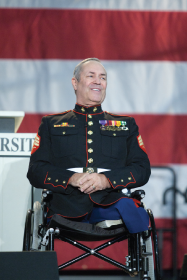 AMerican hero — Dr. Tim Lee receives a standing ovation at Military Emphasis Week convocation. (Photo Credit: Eli Overbey)