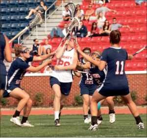 Unstoppable — Freshman Nina Dunay’s five goals against Fresno State lifted the Lady Flames over the Lady Bulldogs in a 14-13 win. Dunay has 21 goals on the year. Photo credit: Chris Mabes