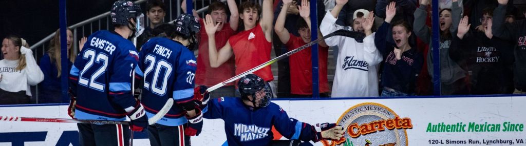 After wiping the Pittsburgh Panthers on their own floor last weekend, the Liberty University Men’s D1 Hockey team claimed another series sweep, this time against the Delaware Blue Hens. The Flames claimed the game one victory 8-3 amid the stadium-shaking crowd during their Midnight Mayhem game, following that victory with a rousing 3-2 overtime win less than 21 hours later.