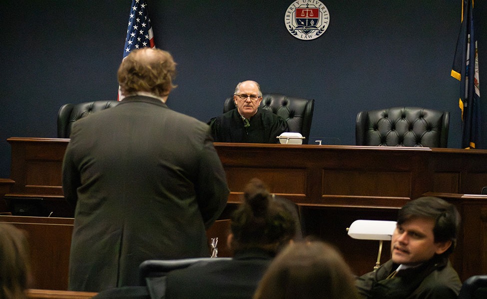 After the initial investigation, the scenario moved to the Liberty University School of Law, where students explored the legal steps required before investigators can continue searching for more evidence. Law students stepped into the roles of prosecutors and defense attorneys in a simulated search warrant hearing.