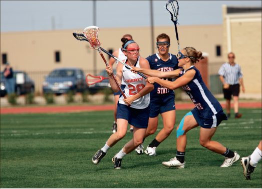 High scoring — The lacrosse team beat Erskine Tuesday with a score of 17-7, led by five scorers with four goals each. Photo credit: Les Schofer