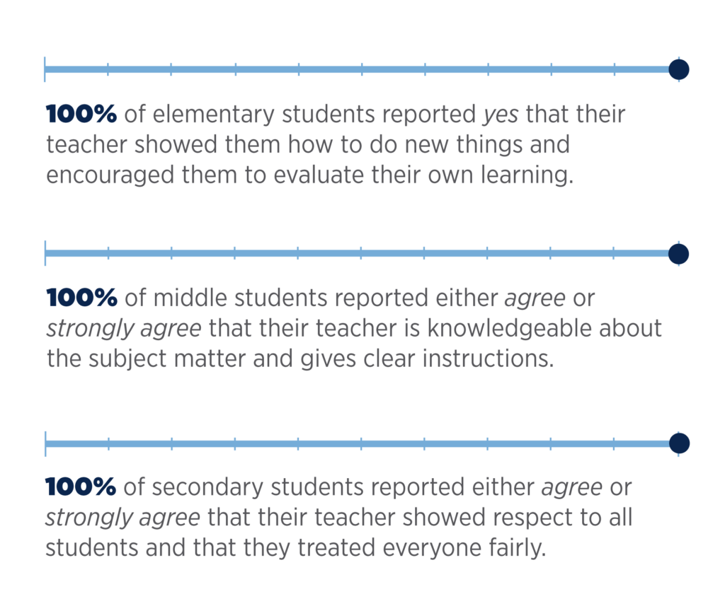 - Middle – 100% of students reported either “Agree or Strongly Agree” that their teacher is knowledgeable about the subject matter and gives clear instructions.