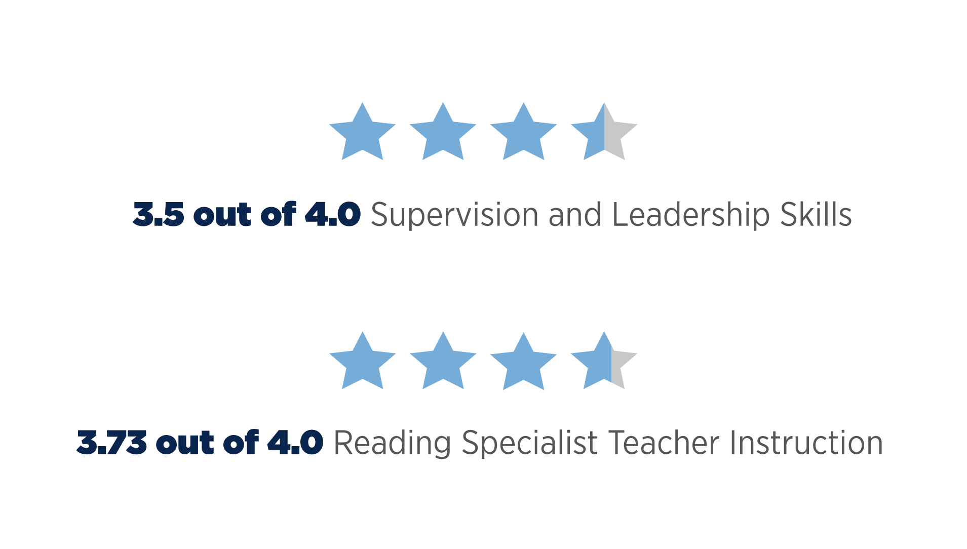 - 3.73 out of 4.0 on the reading specialist’ s ability to instruct and advise teachers in the skills necessary to differentiate reading instruction for both low and high achieving readers. (N=11)