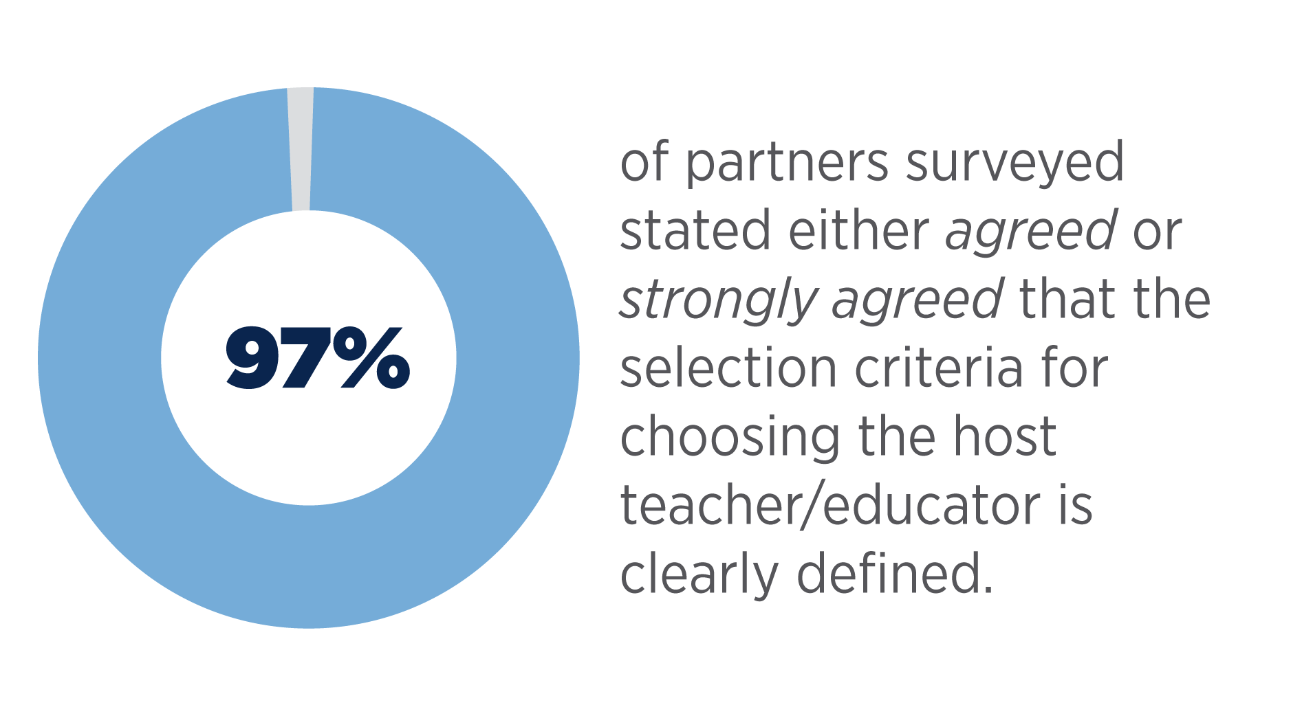 - 97% of partners surveyed stated either strongly agreed or agreed that the selection criteria for choosing the host teacher/educator is clearly defined.