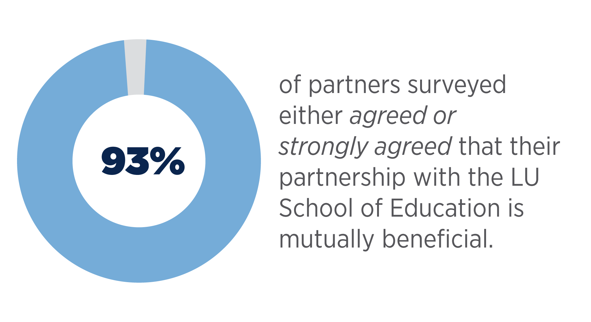 - 93% of partners surveyed stated either strongly agreed or agreed that their partnership with the LU School of Education is mutually beneficial.
