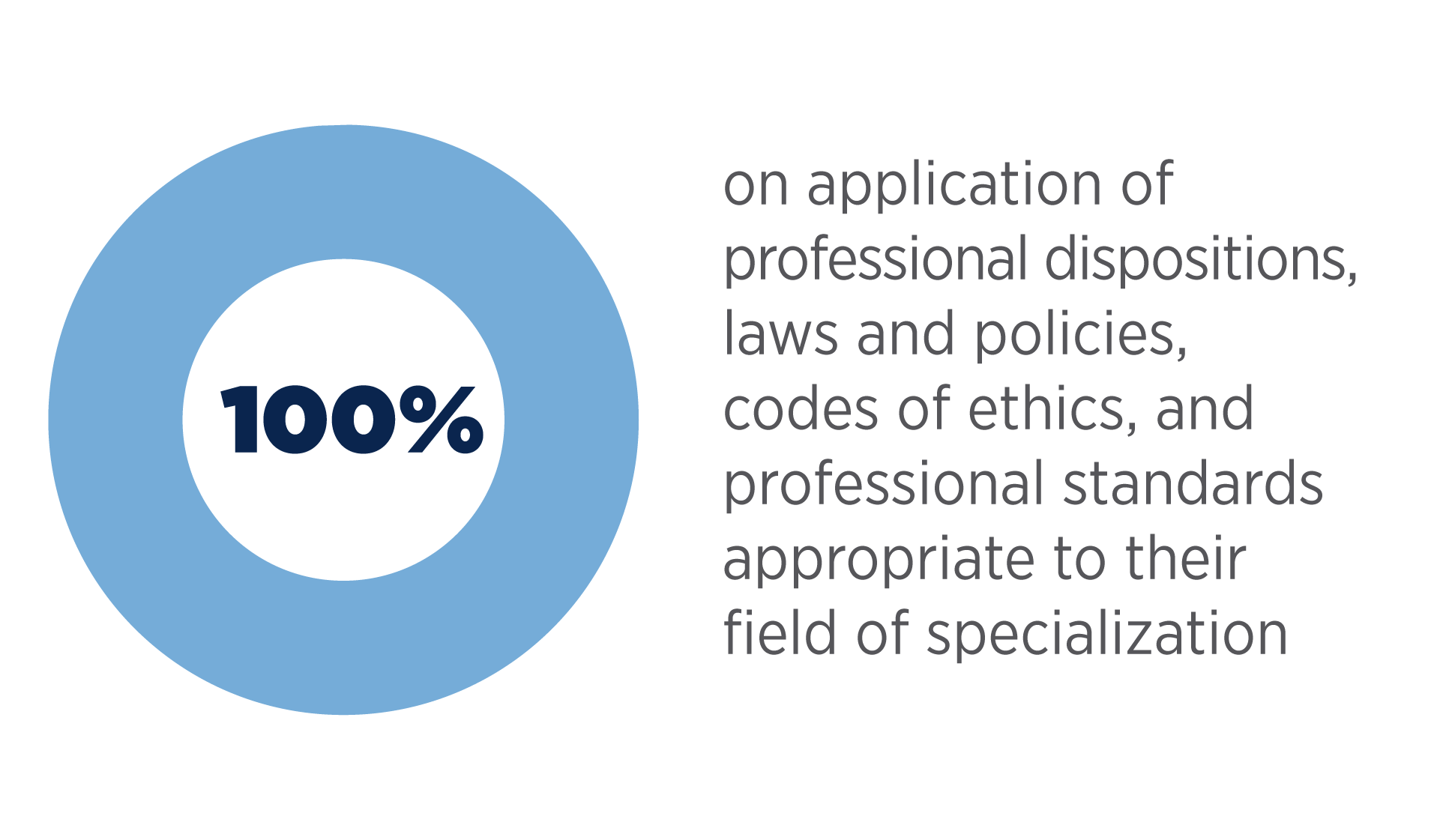 - 100% on Application of professional dispositions, laws and policies, codes of ethics and professional standards appropriate to their field of specialization (graph)