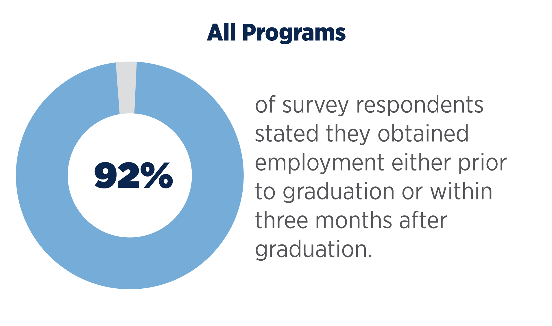 All Programs: 93% of all program completers who were employed prior to graduation stated that they received employment either prior to graduation or within three months after graduation.