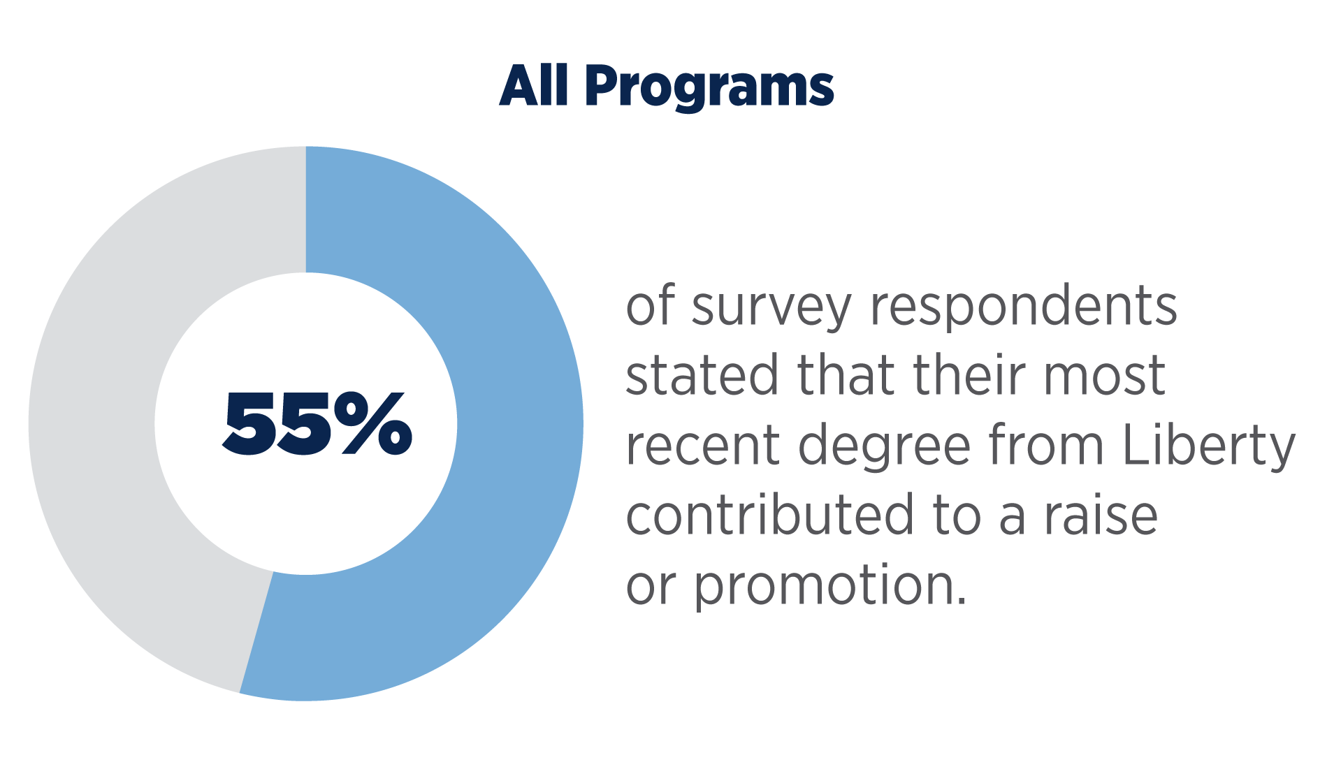 All Programs: 55% of all program completers stated that their most recent degree from Liberty resulted in a raise or promotion.