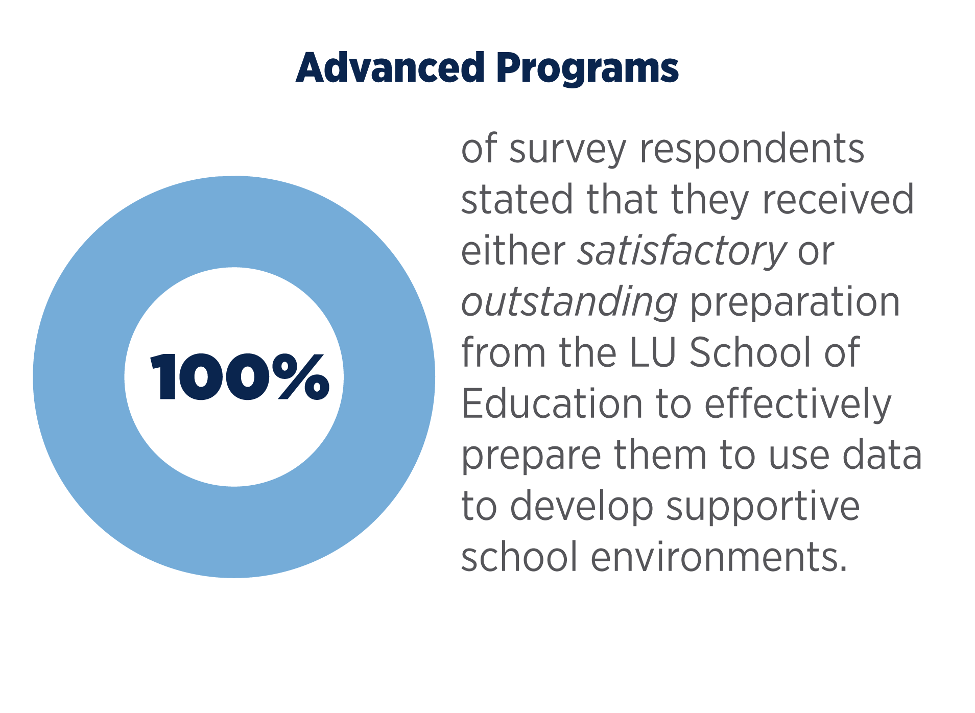 Advanced Programs: 100% of survey respondents who were employed stated that they received either outstanding or satisfactory preparation from the LU School of Education to effectively prepare them to use data to develop supportive school environments.