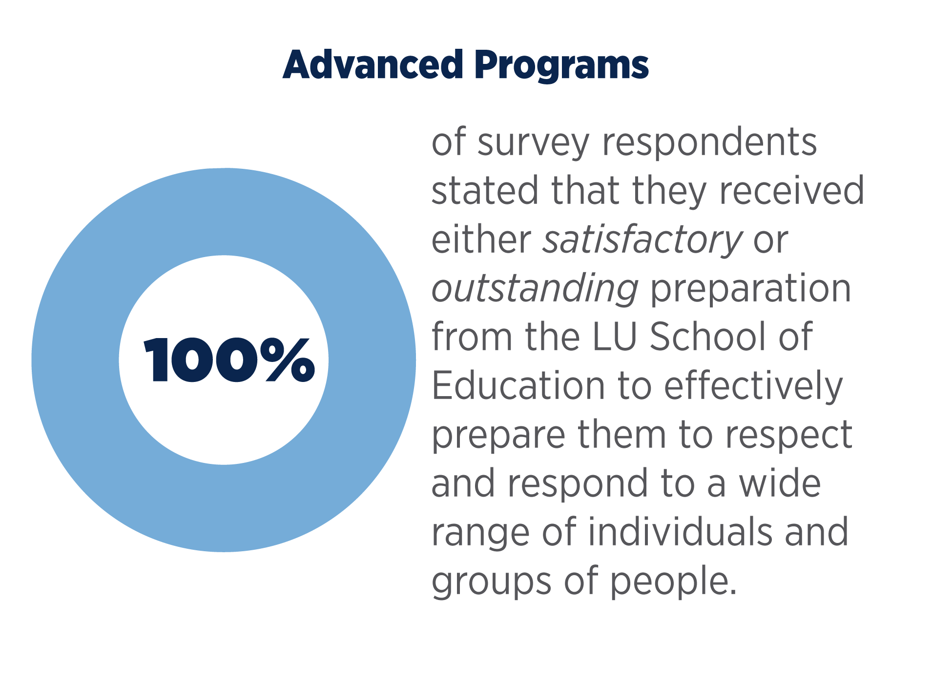 Advanced Programs: 100% of survey respondents who were employed stated that they received either outstanding or satisfactory preparation from the LU School of Education to effectively prepare them to respect and respond to a wide range of individuals and groups of people.