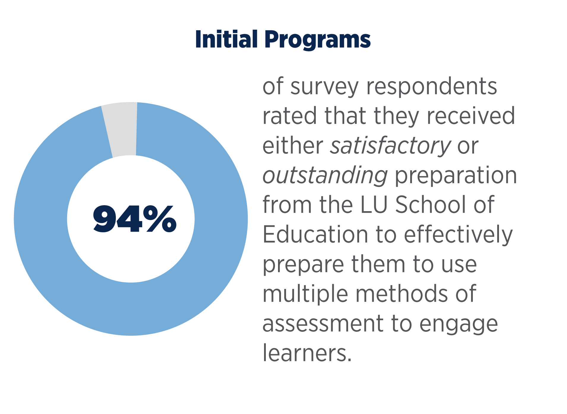 Initial Programs: 94% of survey respondents who were employed rated that they received either outstanding or satisfactory preparation from the LU School of Education to effectively prepare them to use multiple methods of assessment to engage learners.