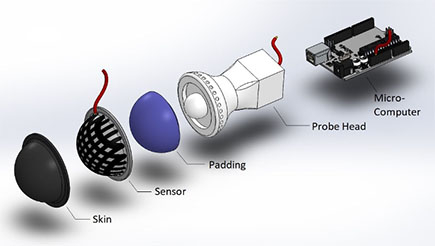 Automating the palpation process is believed to optimize the process of clinical breast examination as the effectiveness of identifying the malign tissue will entirely depend on the sensitivity of the device, and not on the skills of the person who palpate the breast. Automating the process could also allow visualizing abnormal tissues and simplify the process of determining the sizes and mechanical properties of the tissues. As shown in the figure, the system will be composed of a protective layer, electronic sensor, padding layer, probe head, and microprocessor. The electronic sensor is made of a piezoresistive material that changes its electrical resistance when deformed. The padding allows the sensor to deform when it is subjected to a pressure or touch. The deformation induced electrical signals will be collected using the electrodes attached to the sensor, and the data will be used to construct an image that help in determining breast tissues abnormalities.