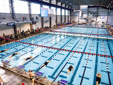 The facility features a nine-lane, 50-meter pool with a movable bulkhead. A separate 17-foot-deep diving well includes 1- and 3-meter springboards and a three-column tower, featuring 1, 3, 5, 7.5 and 10-meter platforms. The 25-yard wide pool can be divided into 20 lanes for short-course training, with an additional eight lanes in the diving well.