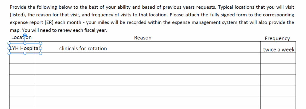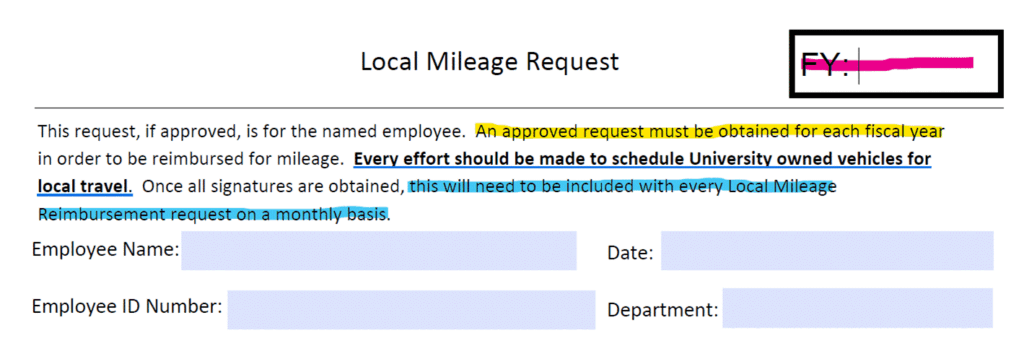 This form is required to be completed once per fiscal year. Please ensure the applicable fiscal year (FY) is entered in the top-right field highlighted in pink. The fully executed (signed) form must be included with every local mileage reimbursement request submitted. Mileage reimbursement requests should be submitted on a monthly basis.