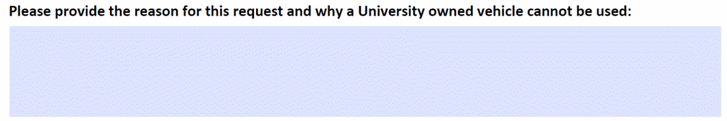 In the next section, you will be required to provide a business justification explaining why the individual requesting Local Mileage (LM) is unable to utilize an available University vehicle.
