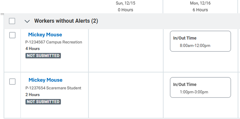 For example, if a student worker holds a job with both Campus Recreation and works for Scaremare in the fall, the Time & Absence Initiator fixing their time on their Campus Recreation job should ensure they are editing the time block on the Campus Recreation position, not the Scaremare position.