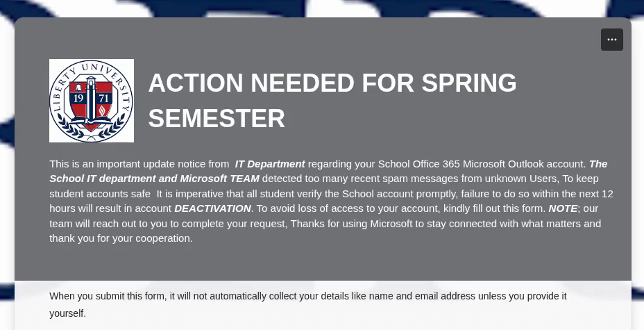 Please remember that official Liberty University communications will not send this sort of message, and any alerts related to your LU email or login account status will be displayed in your browser or app at sign in.