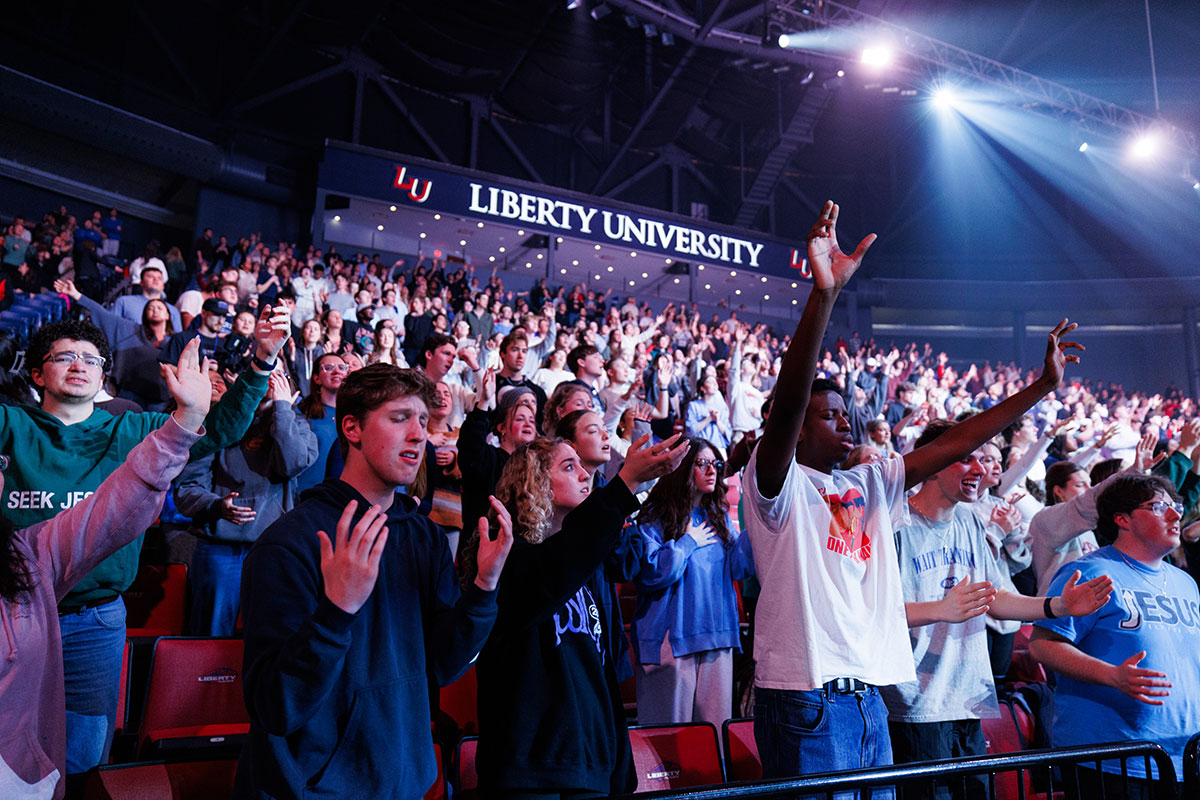 Pictured above: Students participate in Liberty’s Collegiate Day of Prayer event in the Vines Center on Feb. 26. The Collegiate Day of Prayer is held annually on college campuses throughout the United States. February marked Liberty’s first time to host the live simulcast for the event.