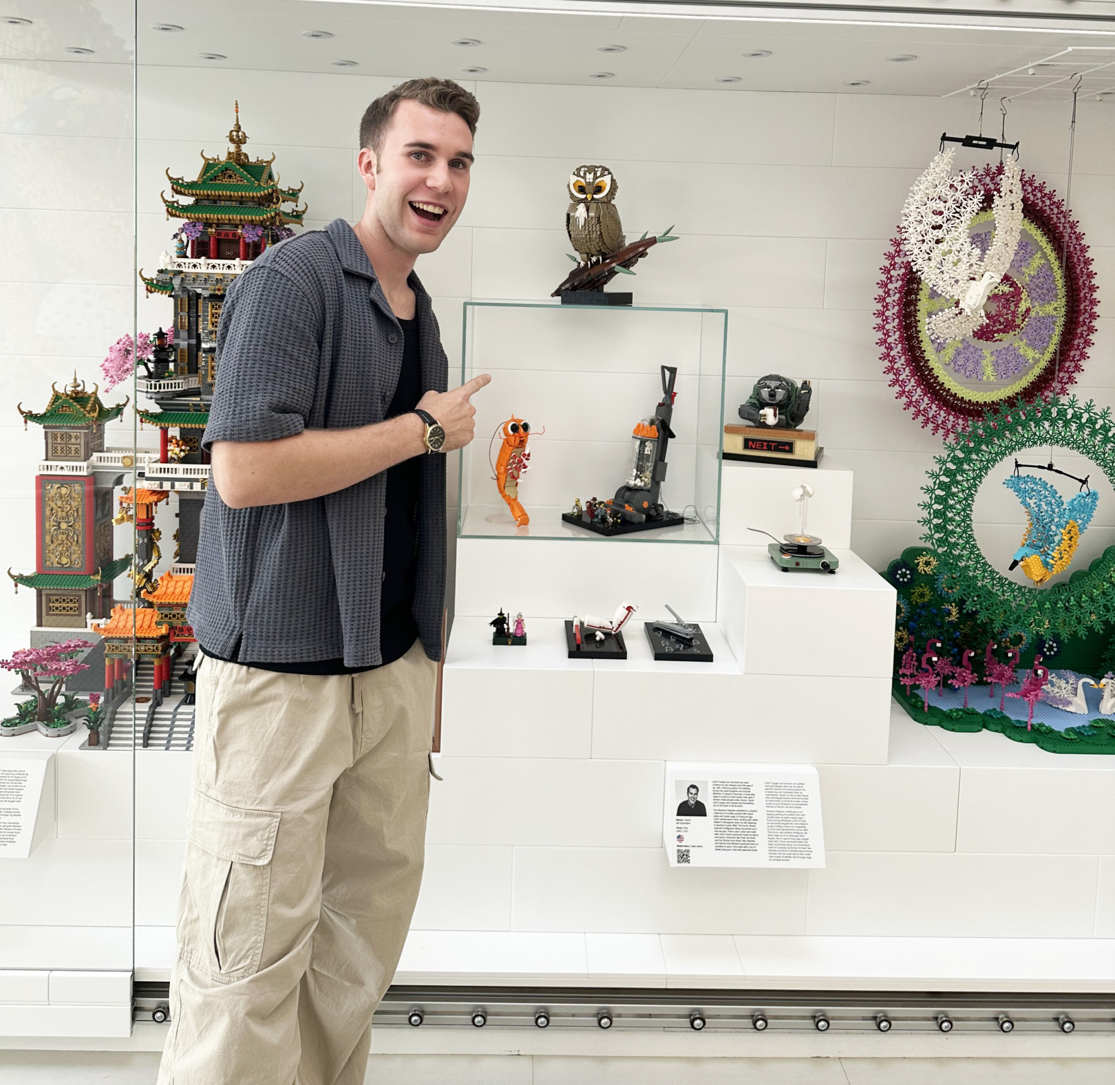 Ian Summers points at some of his pieces on display at the Lego House in Billund, Denmark.