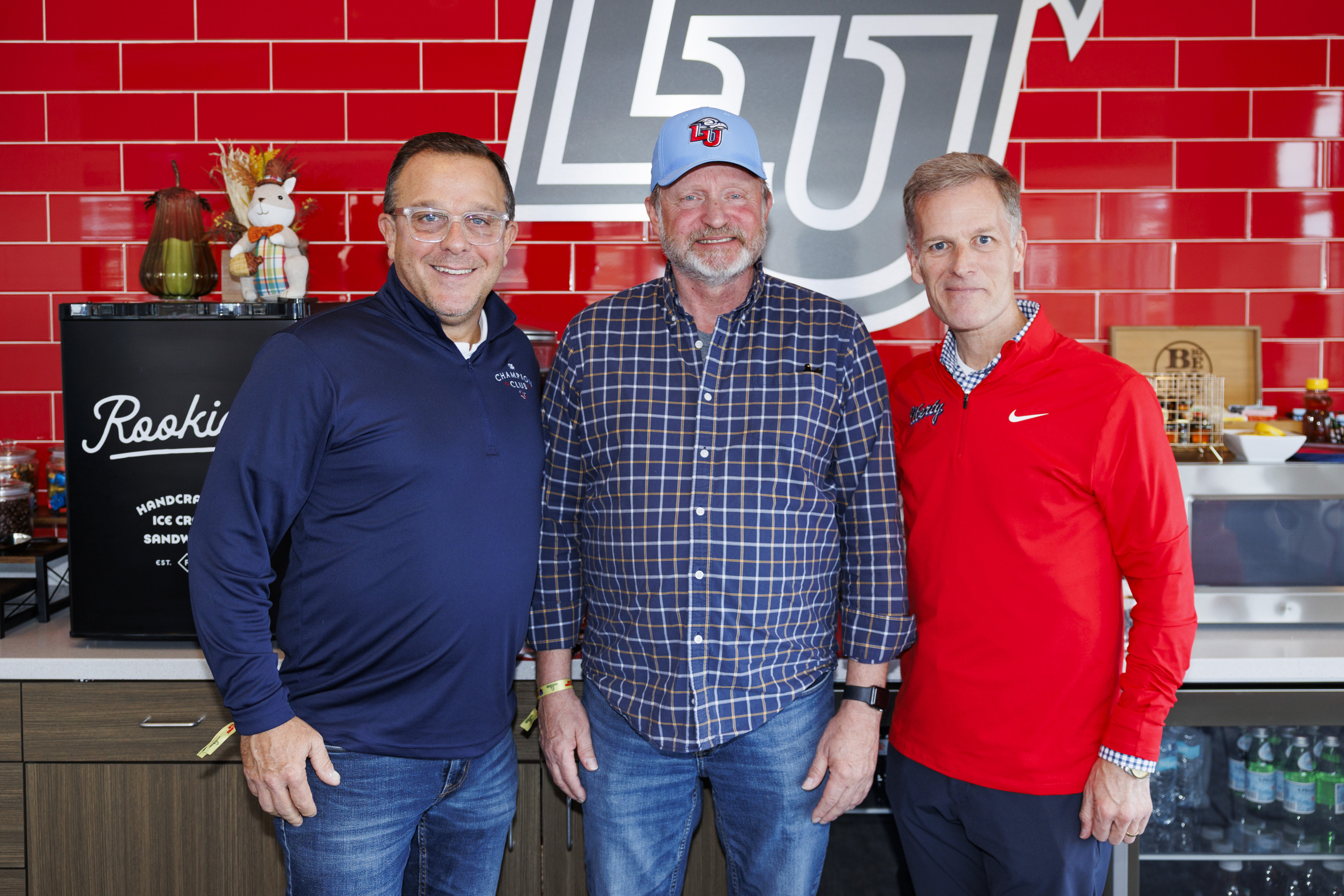 Dr. Steven Johnson (center) poses with Liberty President Dr. Dondi E. Costin and Director of Development Jay Rebsamen (left) in November, 2025. (Photo by: Jessie Jordan)