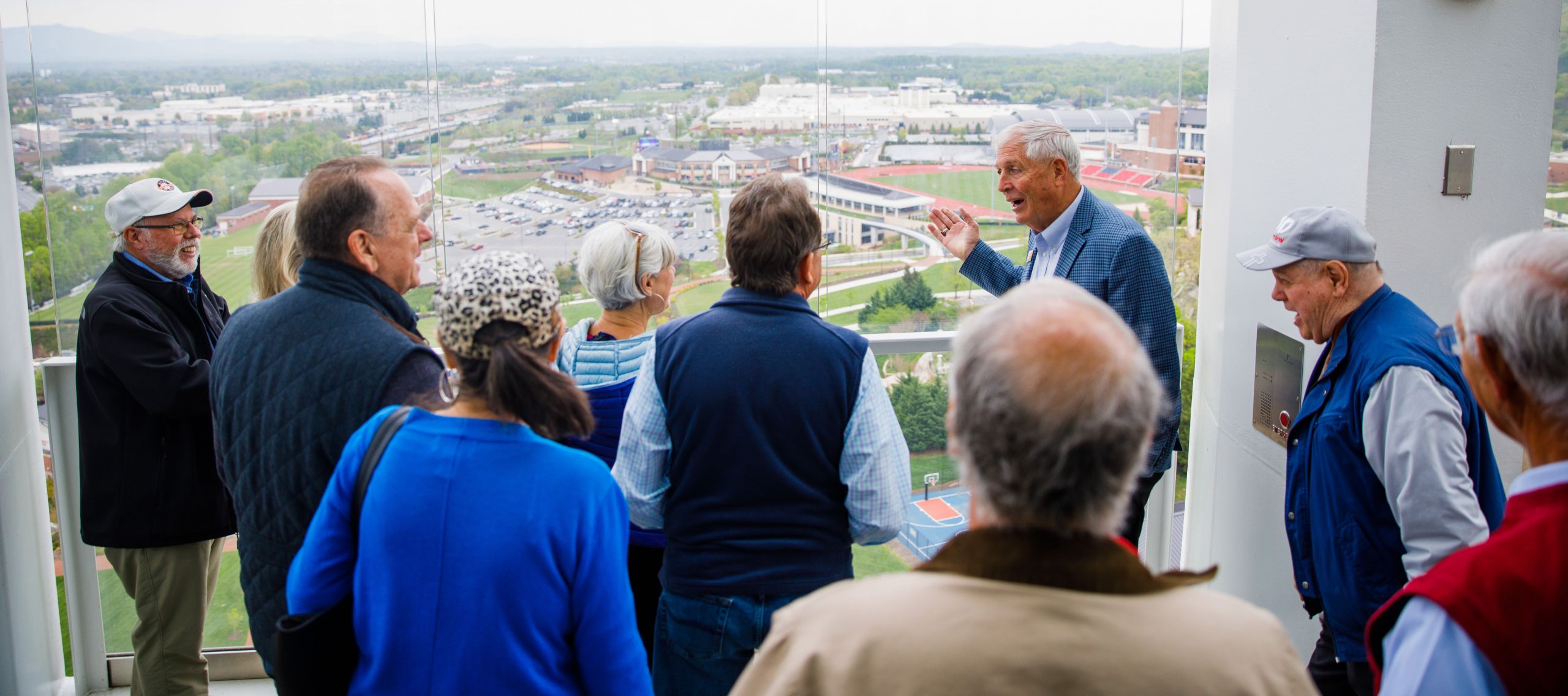 Liberty’s first students marvel at the new Liberty Arena, a recent campus construct that houses men’s and women’s basketball and volleyball. (Photo by Andrew Snyder)