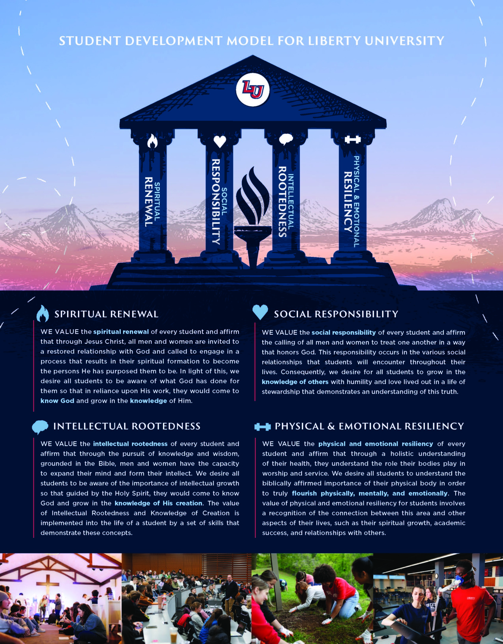 The task force developed a “3D” model for student development and presented it to Liberty’s Board of Trustees last fall. The “Discover, Develop, Deploy” model provides a holistic framework that guides students through an intentional journey of purposeful growth, rooted in our founding mission, to prepare graduates to impact the world for Jesus Christ. Our job is walking them through this transformative experience by helping them discover the academic, spiritual, and professional resources available to every student; develop the mindset and skillset necessary to be effective in their careers as Gospel-minded professionals; and ultimately deploy them into the world as fully trained Champions for Christ.