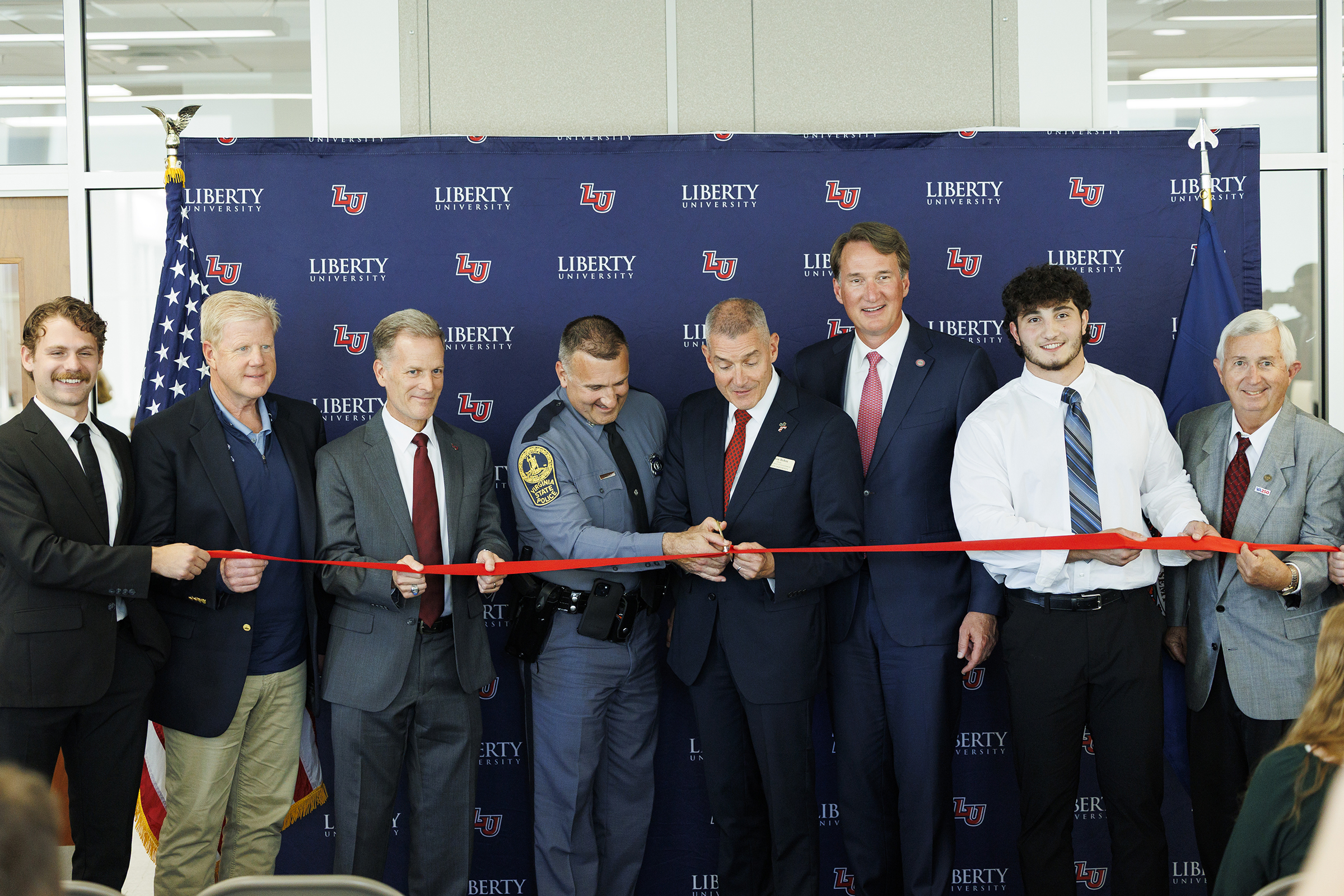 Through a groundbreaking partnership with the Virginia State Police, eligible criminal justice students in the Helms School of Government can complete their undergraduate degrees while simultaneously earning certification through the Virginia State Police Basic Trooper Academy. The announcement was made during a ribbon-cutting ceremony in September attended by former Virginia Gov. Glenn Youngkin and Col. Matthew Hanley, superintendent of the Virginia State Police. Liberty is the first institution to partner with the Virginia State Police for this unique offering.
