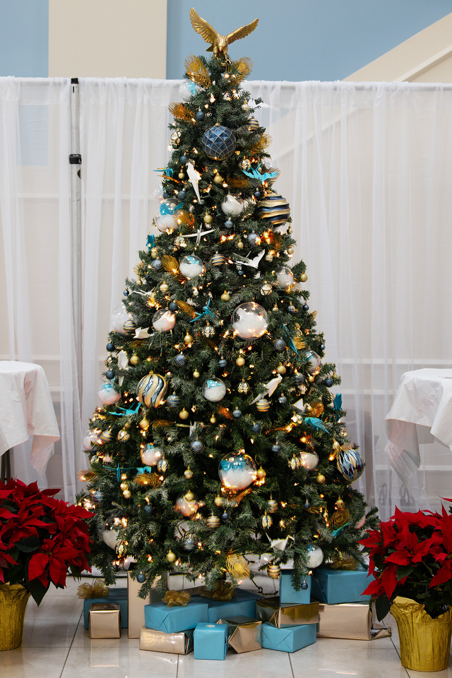 We chose blue and gold as our primary colors to indicate sky and the light provided when we work in missions. There are a variety of different birds placed on the tree, as well as in the small, clear ornaments. We wanted to not only explain the concept of ‘Lift’ with the birds, but also the unity in diversity with the different types of birds that still work cohesively together on the tree. In the story of Noah, the birds were the messengers who helped Noah know when the waters had departed. The birds we added to the tree are a small tie to the missions we are called to as Christians. For the large, clear ornaments, we chose to add angels to further represent the missions side of the School of Aeronautics. The angels are messengers of God, bringing the good news to people. Likewise, we, as Christians, are called to be messengers and to spread the good news of Jesus Christ to those around us.