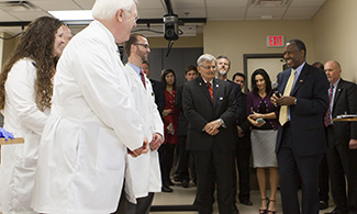 Following the press conference, LUCOM Dean Ronnie Martin, D.O., took Dr. Carson on a tour of the Center for Standardized Patients and Simulation (SIM lab) where student-doctors learn in simulated environments as well as interact with trained actors.
