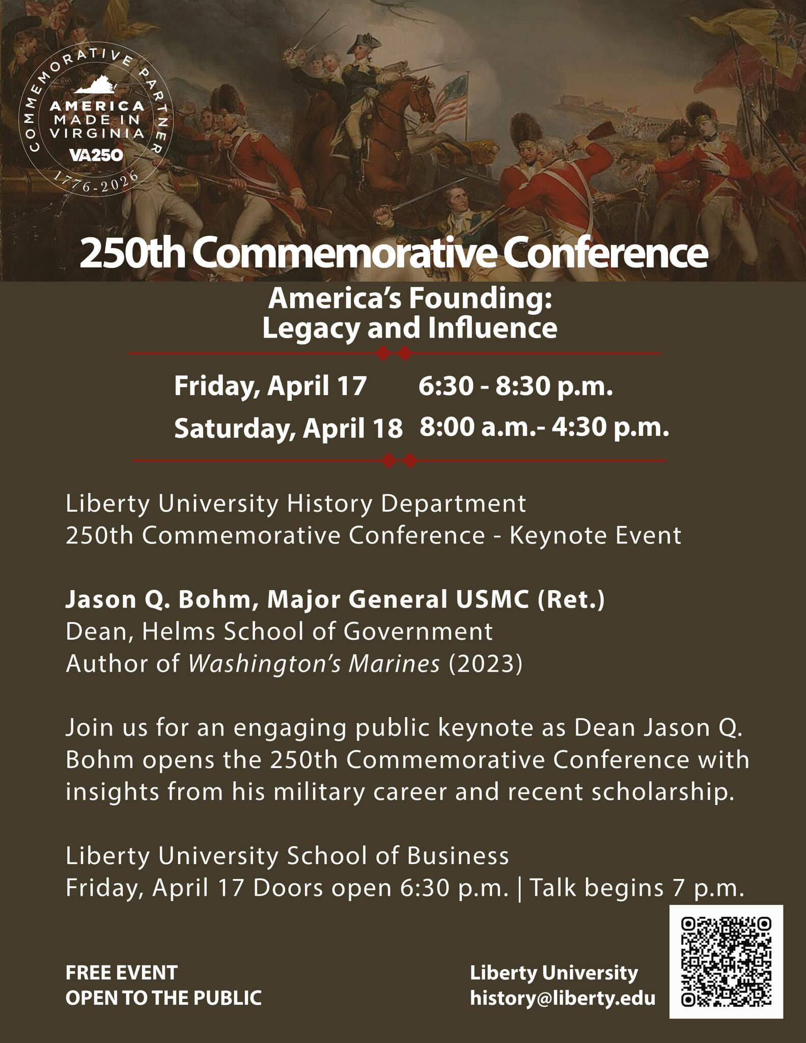 This conference is free and open to the public and will feature a rich program of presentations, panels, and public history initiatives that explore the religious, intellectual, and political foundations of America’s Founding with a keynote address by Maj. Gen. USMC (Ret.) Jason Bohm, Dean of the Helms School of Government and author of Washington’s Marines.