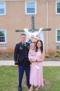 Army Reserve Chaplain (Major, Promotable) Joe Dekreon, pictured with his wife, Diana, and their daughter at Lynchburg City Church’s Easter Service, April 20, 2025.