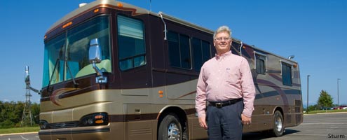 Photo caption: Harold Knowles, a Planned Giving Officer for Liberty University, stands in front of the 35-foot luxury motorhome recently acquired by Liberty, thanks to the generosity of a loyal supporter, Charles “Red” Stone of Amelia, Va.