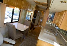 The “extras” include an automatic awning that senses rain, a kitchen that slides out — plumbing, wiring and all — to expand the living area, a bed and a pull-out sofa to sleep four, two sizeable flat-screen TVs, GPS, all necessary kitchen appliances, a combination washer/dryer, and plenty of storage space throughout. The design, with recessed lighting and a decorative ceiling, adds to its appeal.