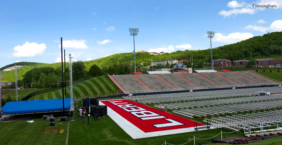 Crews work to put a stage and technical equipment in place at Liberty University’s Arthur L. Williams Stadium in preparation for Saturday’s Commencement.