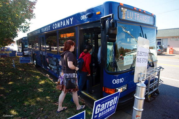 Liberty students turned out by the busloads yesterday to vote at the Heritage precinct — Lynchburg’s busiest precinct. With about 3,200 students eligible to vote locally, Liberty cancelled classes and arranged for buses to take students to the polls in regular four-minute intervals, from 6:50 a.m. to 7:30 p.m.