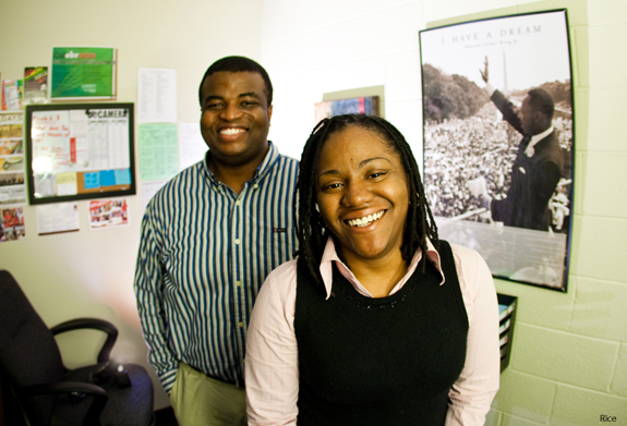 Adedamola Onafowokan and Daveta Saunders pose in front of a poster of Dr. Martin Luther King Jr. at Liberty’s Center for Multicultural Enrichment. The Center is hosting a presentation on King’s life on Thursday.