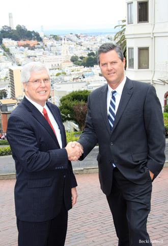 | Chancellor Jerry Falwell, Jr. congratulates Mat Staver, dean of Liberty University School of Law, in San Francisco on Thursday. |