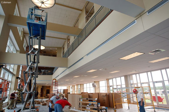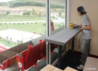 Last-minute construction continues on the Flames Club level of the new Williams Stadium football tower.