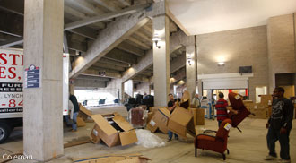 | On the concourse level, furniture for the Flames Club luxury suites are being unloaded. |