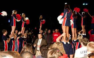 | Head football coach Danny Rocco and the Liberty cheerleaders kick off the bonfire Friday night.View more homecoming photos |