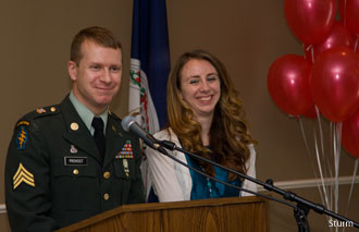 Red balloons, tables displaying Provost’s military and academic awards and distinctions, as well as photo albums from Provost’s previous tours of duty to the Middle East lined the room. Guests were asked to write words of encouragement on keepsake cards for Provost to read while overseas.