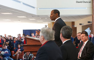 After a loud, long applause from the audience, which included members of the Flames football team, Flames Club members, Liberty Athletics staff, and students, faculty and other university staff, Gill addressed the crowd, then answered questions.