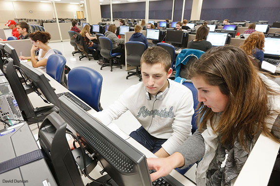Class assignments are delivered on one of the emporium’s 252 computers through “MyMathLab” software. Lessons include a short video, a concept quiz, homework exercises and tests.