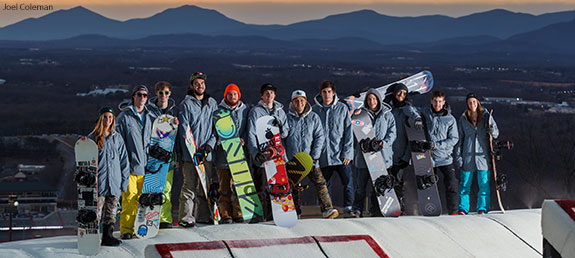 Liberty University’s ski and snowboard team poses atop the jumps at the Liberty Mountain Snowflex Center overlooking the sprawling campus below and the distant Blue Ridge Mountains.